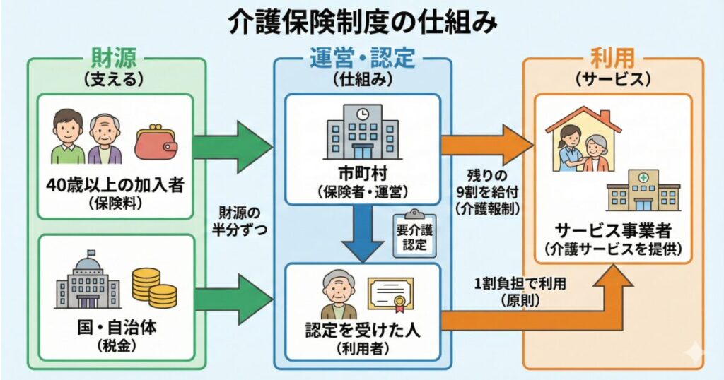 介護保険制度とは高齢や病気で介護が必要になった人が、住み慣れた地域で安心して生活を続けられるよう支援する公的な制度です。