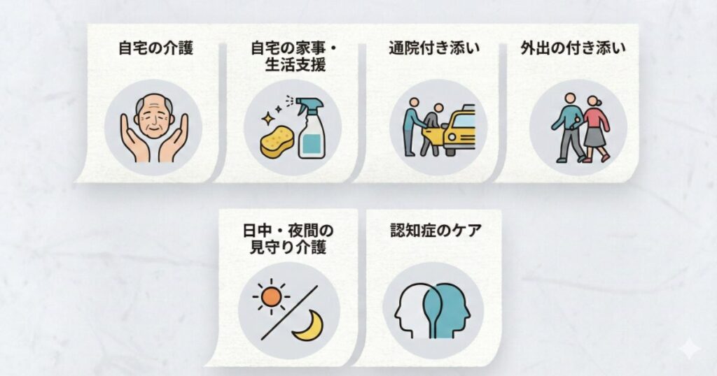 - 訪問介護:入浴や排泄の介助、掃除や調理など日常生活のサポートを行う