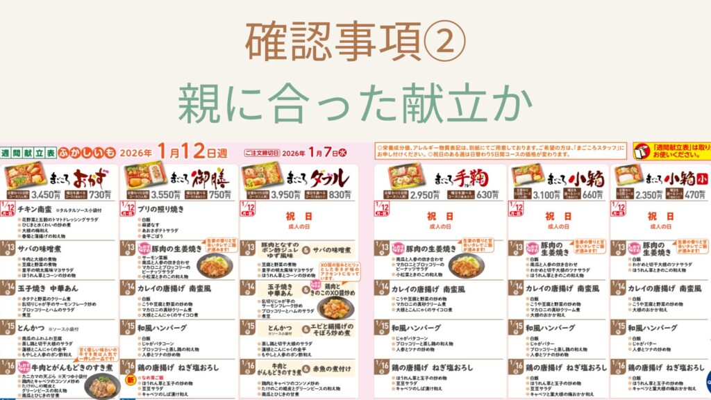 一方で、食べやすさや持病への配慮、量・価格が合っているかなど、事前に確認しておきたいポイントもあります。